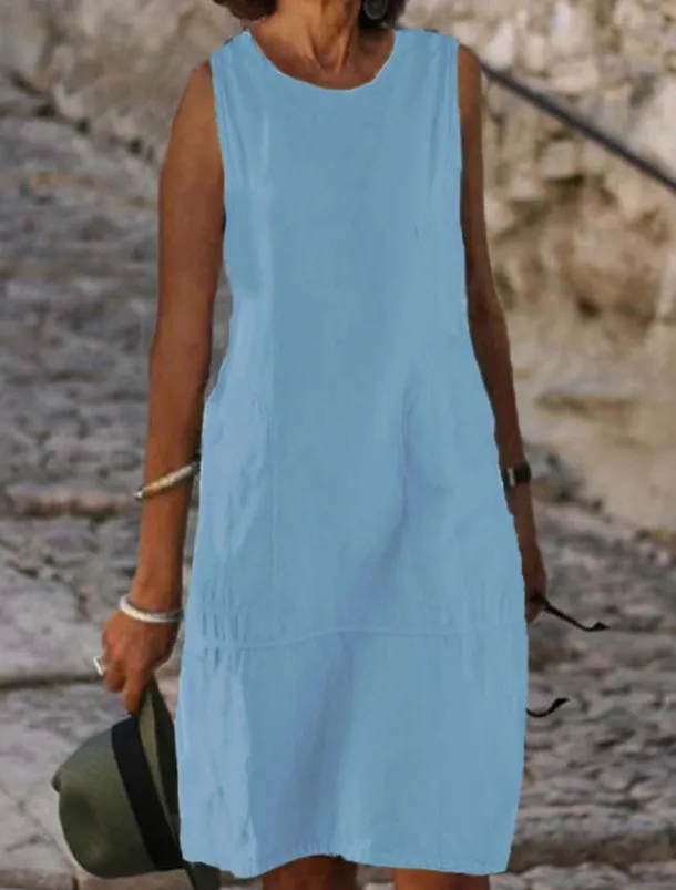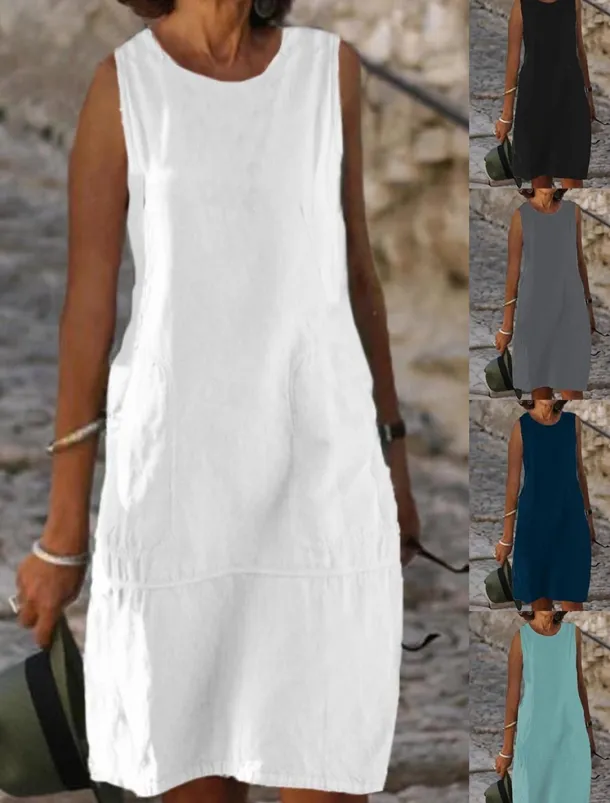 The U Neck Cotton Blend Shift Dress is the embodiment of casual elegance Adorned with pockets and perfect for summer to fall this midi dress combines comfort and style Its sleeveless loose fit design machine washable care and timeless plain pattern makes it an ideal choice for daily wear or vacation getaways Available in light blue black and white