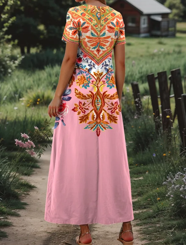 Women’s Maxi Dress Sundress A Line Dress Vacation Casual Beach Regular Fit Graphic Tribal Short Sleeve V Neck Pink Blue Purple Green Summer Spring