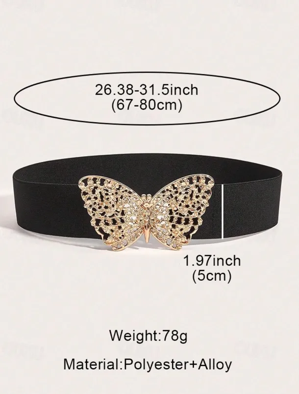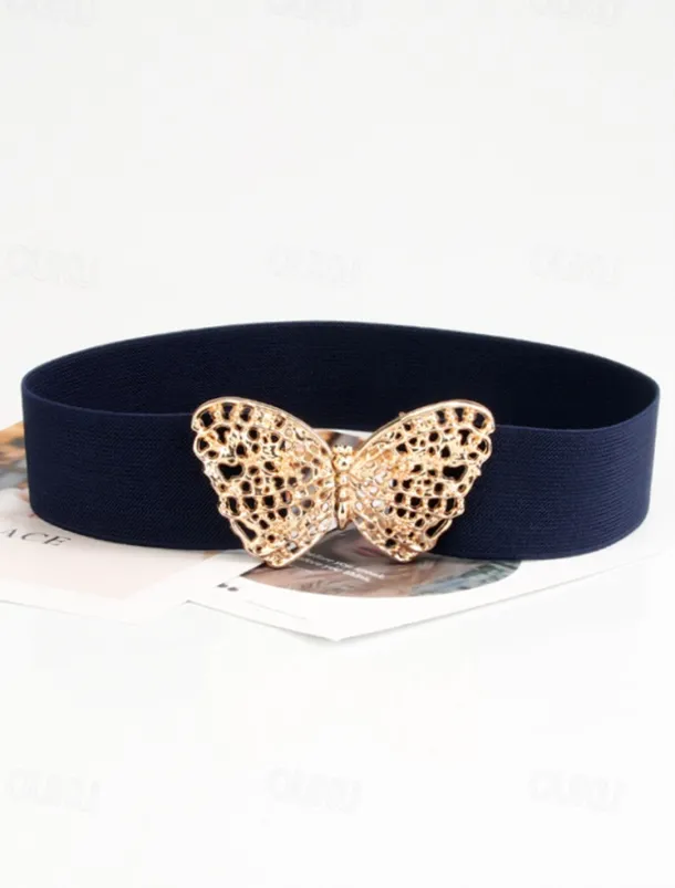 Women’s Navy Blue Elastic Waist Belt with Gold Butterfly Buckle | Perfect for Dresses and Skirts