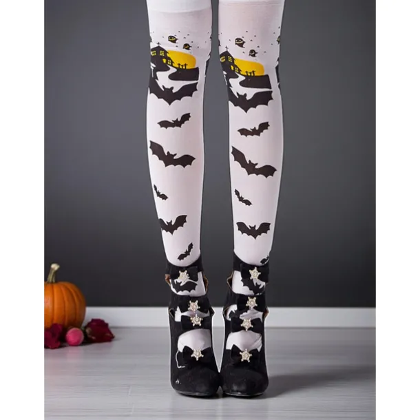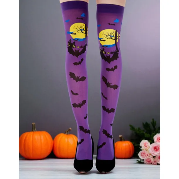 Women’s Orange Over-the-Knee Socks with Black Bat and Haunted House Print, Fun Halloween Party Hosiery