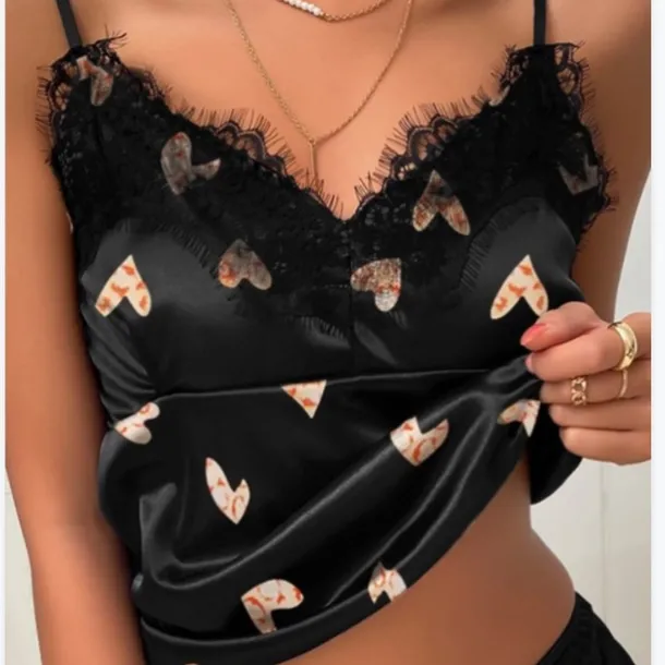 – Womens heart print pajama top with sleeveless design and v neck for a stylish look.