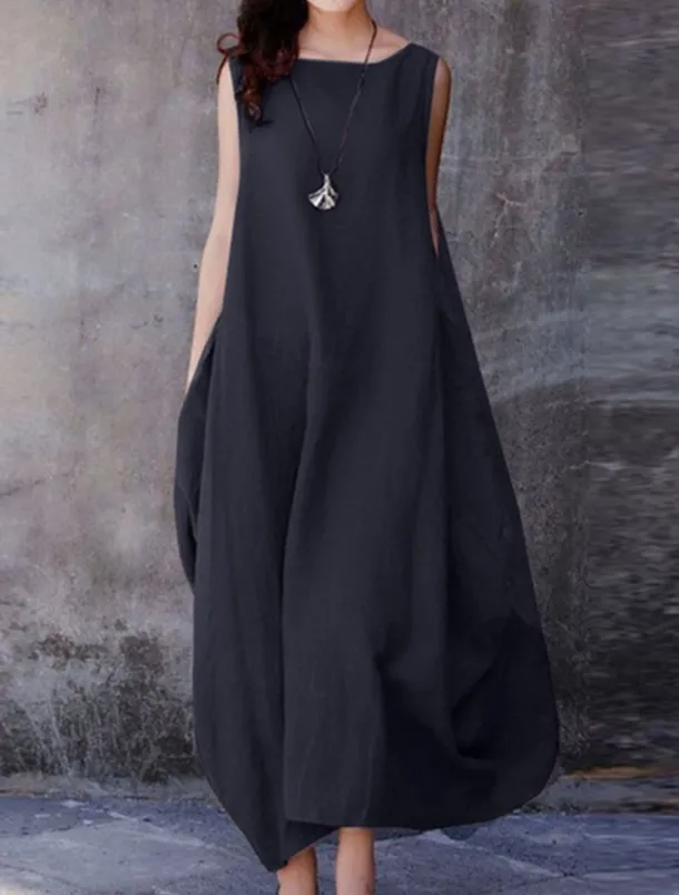 – It is a sleeveless cotton linen dress that can be worn as a casual summer dress, an oversized midi dress, a holiday dress, party dress, plus size linen dress, boho vintage dress, maternity dress, baggy sundress, or kaftan with pockets.