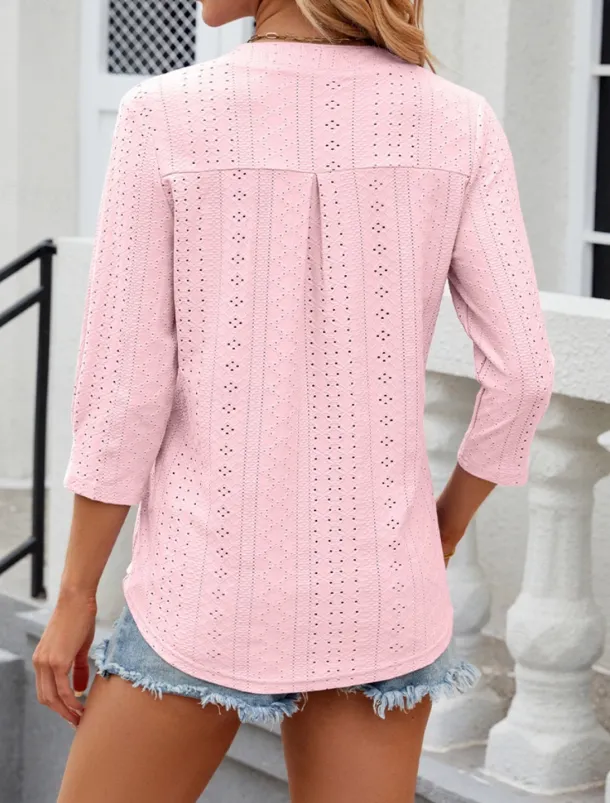 Women’s Shirt Blouse Floral Stylish Casual Long Sleeve Notched Neck Regular Tops Daily Eyelet White Pink Summer Spring